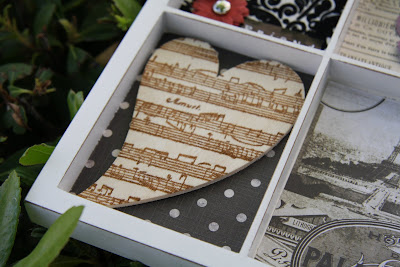 For the heart which I found at a chain craft store, I used a wooden stamp & Tim Holtz's Vintage Photo Distress Ink. I HEART Tim's Distress ink... let's be honest, I HEART Tim's creativity!